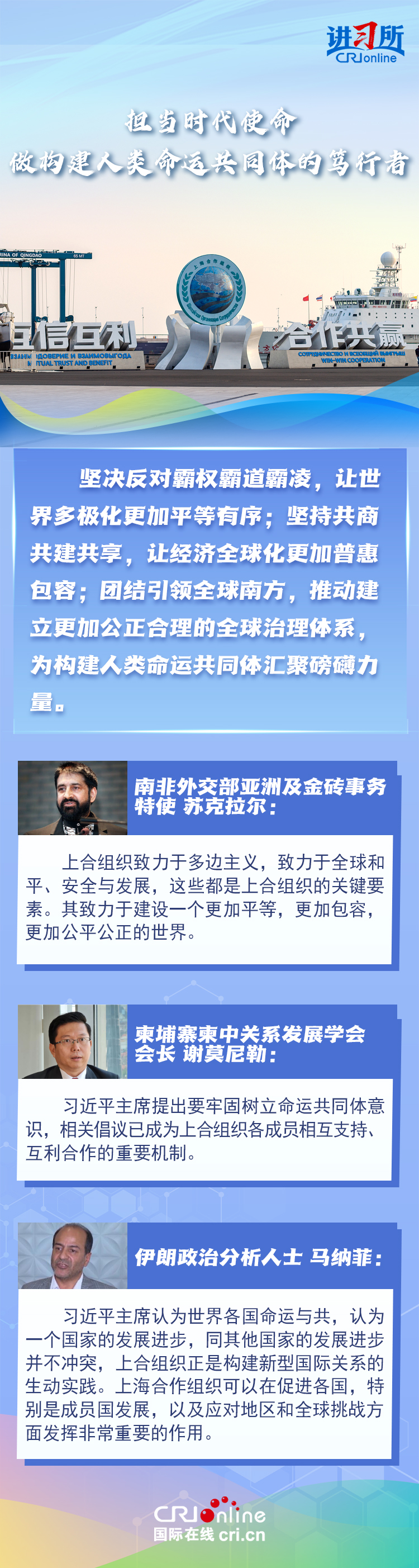 “讓‘上海精神’持續(xù)照亮構(gòu)建上海合作組織命運(yùn)共同體之路?!鄙虾:献鹘M織成立24年來,始終秉持“上海精神”,成功走出了一條順應(yīng)時(shí)代潮流、契合各方需求的區(qū)域合作道路,樹立起新型國(guó)際關(guān)系的典范。在國(guó)際人士眼中,上海合作組織站在歷史正確一邊,致力于建設(shè)一個(gè)更加平等,更加包容,更加公平公正的世界,對(duì)維護(hù)地區(qū)和全球和平至關(guān)重要。