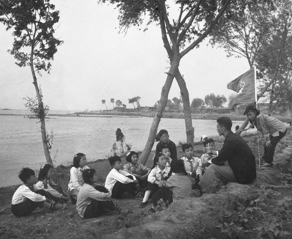 1955年,在河北白洋淀,新安小學(xué)的少先隊(duì)員們聽曾擔(dān)任過(guò)抗戰(zhàn)時(shí)期兒童團(tuán)團(tuán)長(zhǎng)的陳殿元講抗戰(zhàn)故事。