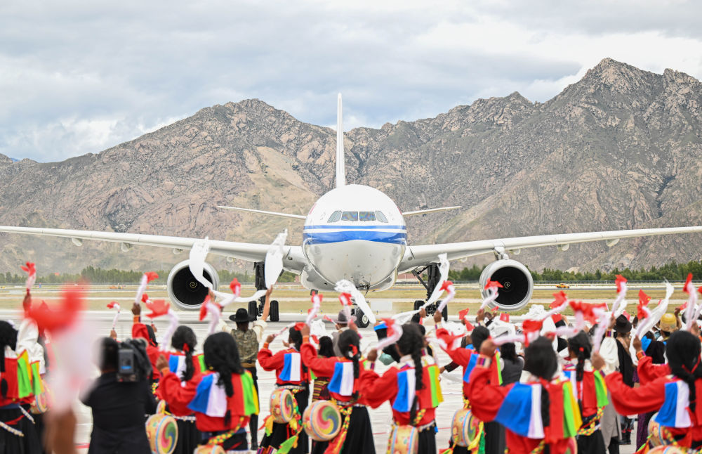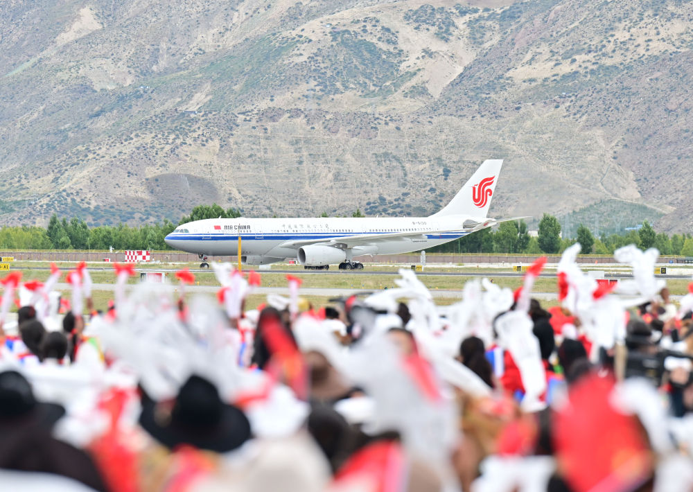 中共中央總書記、國家主席、中央軍委主席習(xí)近平率中央代表團20日中午乘專機抵達拉薩,出席西藏自治區(qū)成立60周年慶?;顒?。習(xí)近平等在機場和拉薩市區(qū)受到西藏各族群眾的熱烈歡迎。