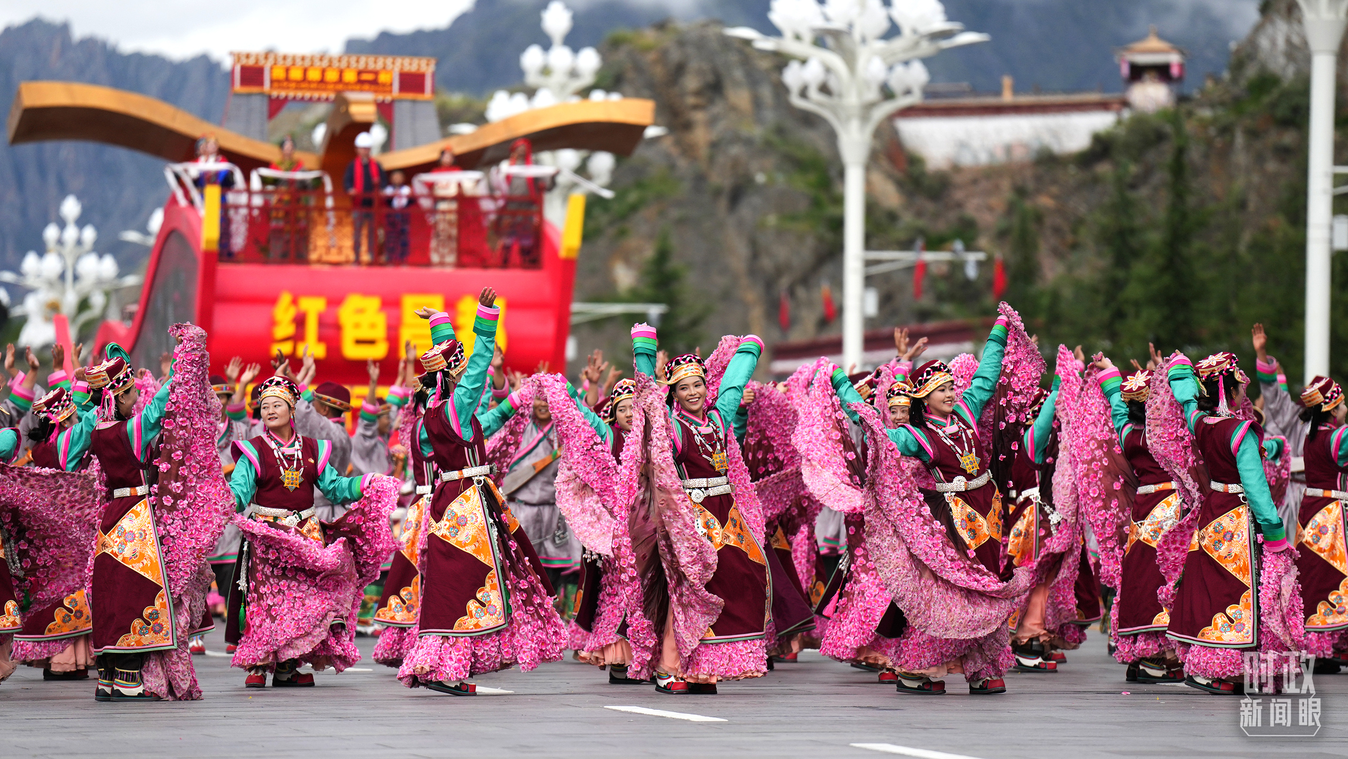 六十載櫛風(fēng)沐雨,一甲子滄海桑田。格?;êH何柚校茡P(yáng)的扎念琴聲響起,雄渾的甲諧舞、瓊結(jié)卓舞、弦子舞、鍋莊舞、普蘭宣舞應(yīng)接不暇,舞出西藏繁榮發(fā)展的精氣神。身穿工布服飾、飛天服飾等藏族特有服飾的游行群眾,以一場(chǎng)非物質(zhì)文化遺產(chǎn)的盛宴向西藏自治區(qū)成立60周年獻(xiàn)禮。