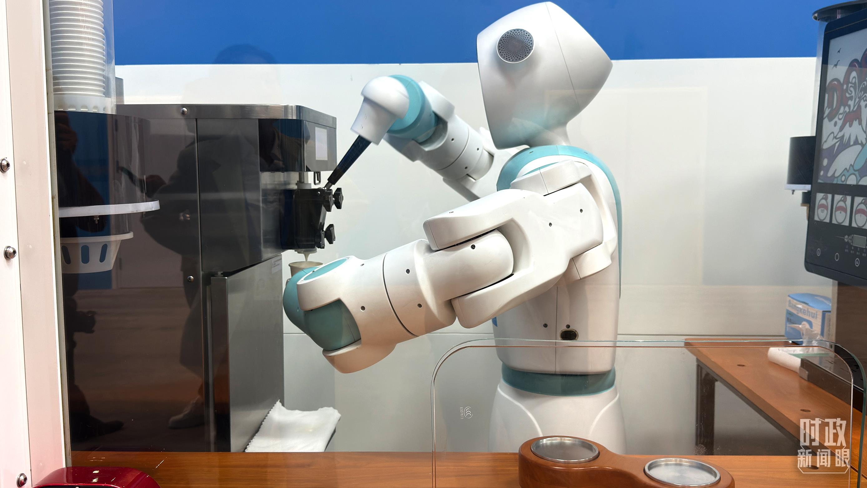 峰會新聞中心的智能機器人正在制作冰淇淋。(總臺央廣記者張永鵬拍攝)