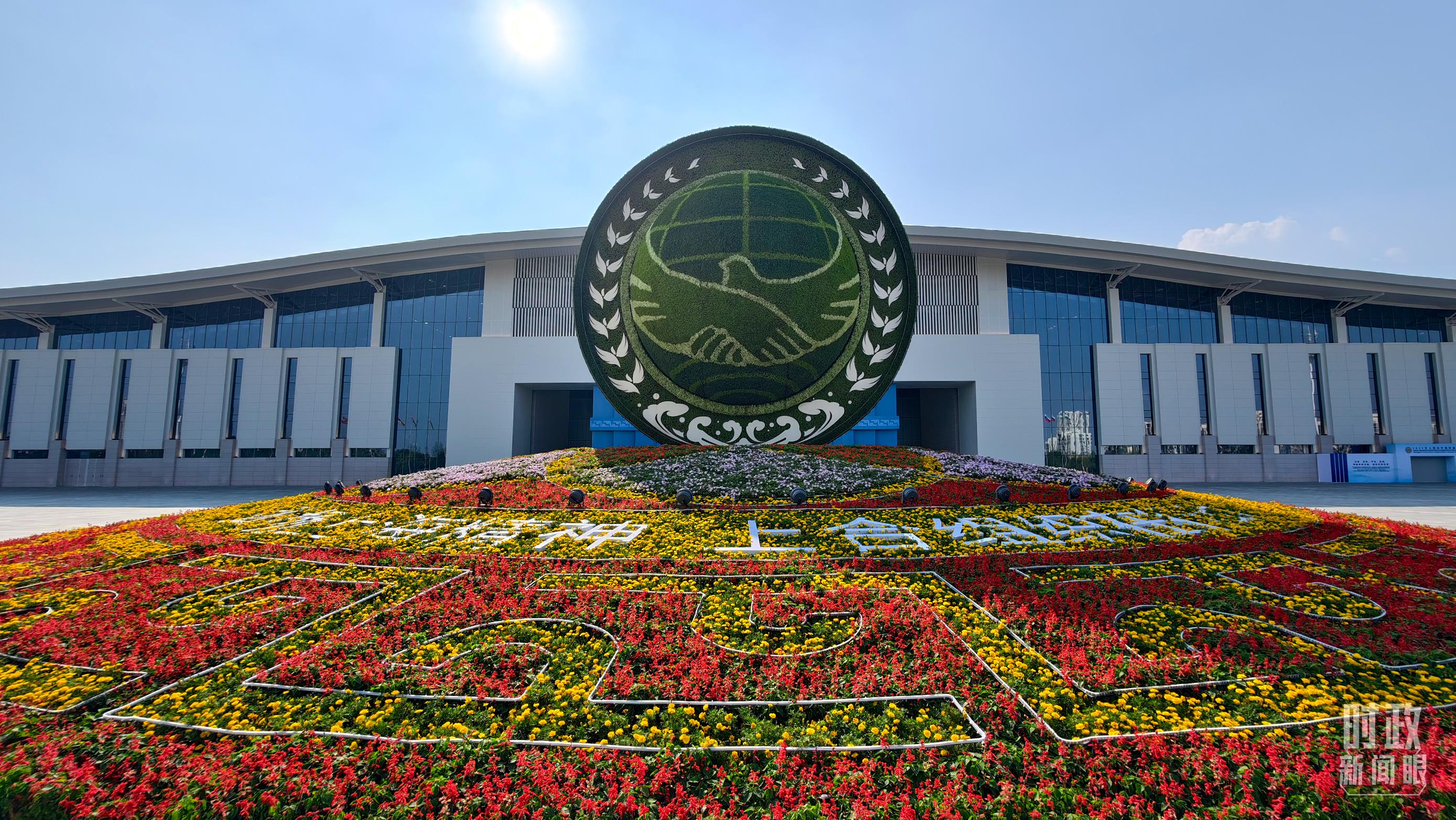 與會各國國旗、上合組織會旗和聯(lián)合國旗幟組成的恢弘旗陣。(總臺央視記者劉琦拍攝)