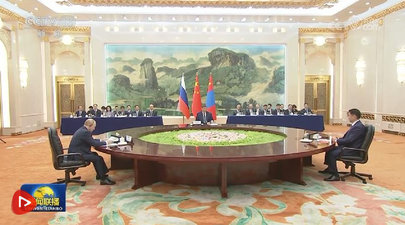 9月2日上午,國家主席習(xí)近平同俄羅斯總統(tǒng)普京、蒙古國總統(tǒng)呼日勒蘇赫在北京人民大會堂舉行中俄蒙三國元首第七次會晤。