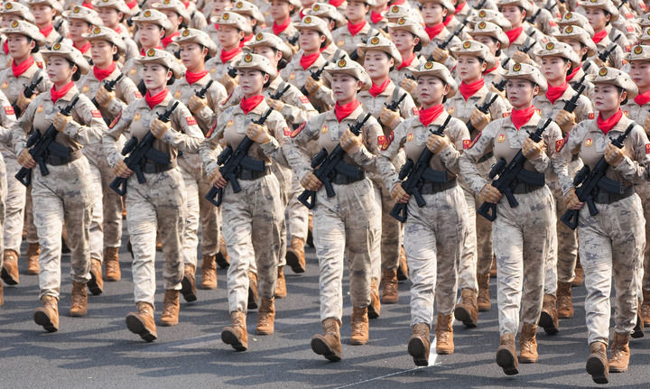 9月3日,天安門廣場(chǎng)。身著蛙式作訓(xùn)服、手握鋼槍的女民兵,身姿挺拔、英姿颯爽。她們來(lái)自當(dāng)年的主要抗日根據(jù)地。這是民兵首次亮相以紀(jì)念抗戰(zhàn)為主題的閱兵活動(dòng)。