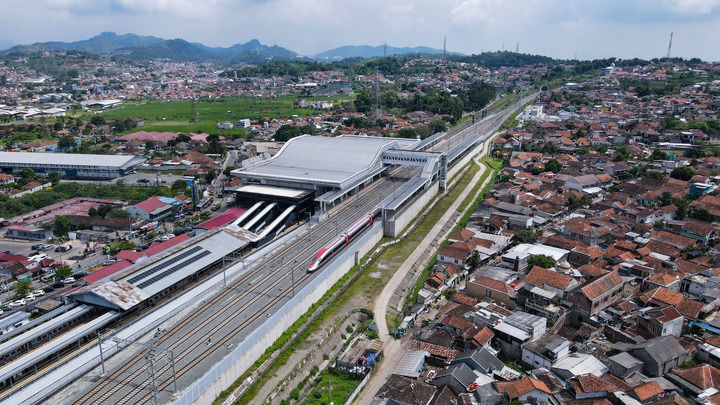 這是2025年5月20日在印度尼西亞帕達拉朗拍攝的雅萬高鐵列車(無人機照片)。新華社記者 徐欽 攝