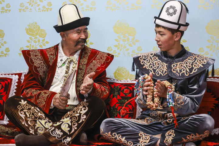《瑪納斯》國家級非物質文化遺產(chǎn)代表性傳承人江努日·圖日干巴依(左)教徒弟演唱《瑪納斯》(2025年4月21日攝)。新華社記者 王菲 攝