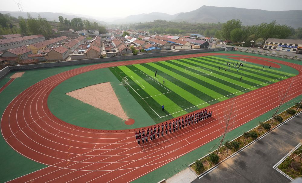 在位于山東濰坊市臨朐縣石家河村的臨朐縣彌水教育集團石家河校區(qū),學(xué)生在操場塑膠跑道上進行體育鍛煉(2025年4月17日攝)。新華社記者 徐速繪 攝