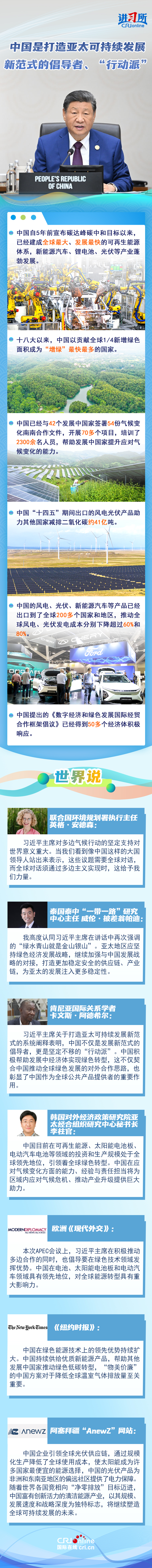 國(guó)際社會(huì)認(rèn)為,中國(guó)不僅是打造亞太可持續(xù)發(fā)展新范式的倡導(dǎo)者,更是堅(jiān)定不移的“行動(dòng)派”,亞太地區(qū)應(yīng)堅(jiān)持綠色經(jīng)濟(jì)發(fā)展戰(zhàn)略,繼續(xù)加強(qiáng)與中國(guó)發(fā)展戰(zhàn)略的對(duì)接,打造更加穩(wěn)定安全的供應(yīng)鏈、產(chǎn)業(yè)鏈,為亞太的發(fā)展注入更多穩(wěn)定性。
