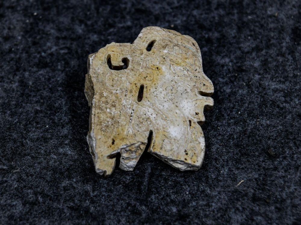 2024年7月10日在四川省文物考古研究院拍攝的三星堆遺址出土的玉石上陽刻的側身人像。三星堆遺址新發(fā)現(xiàn)與玉石器生產(chǎn)加工相關的遺存,專家初步判斷為玉石器“生產(chǎn)車間”,年代為商代中期,距今約3500年至3400年。