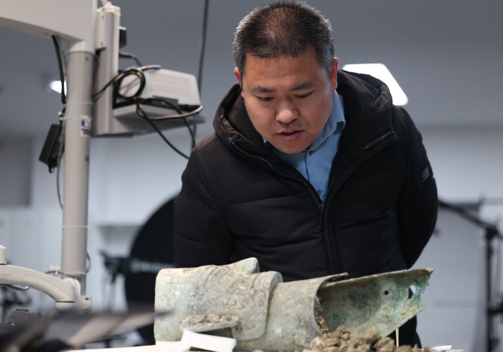 2024年12月16日,考古專家在三星堆研究院仔細查看一件青銅面具。當日,古蜀文明保護傳承二期工程在三星堆研究院啟動。