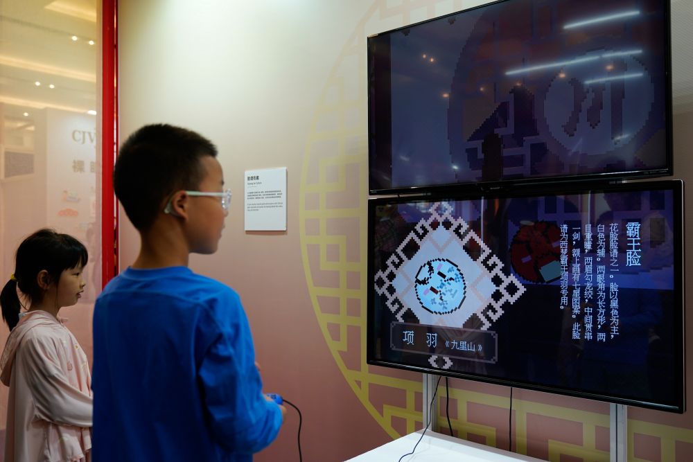 2025年5月31日,在第九屆中國成都國際非物質文化遺產(chǎn)節(jié)上,小朋友通過互動游戲了解川劇臉譜。
