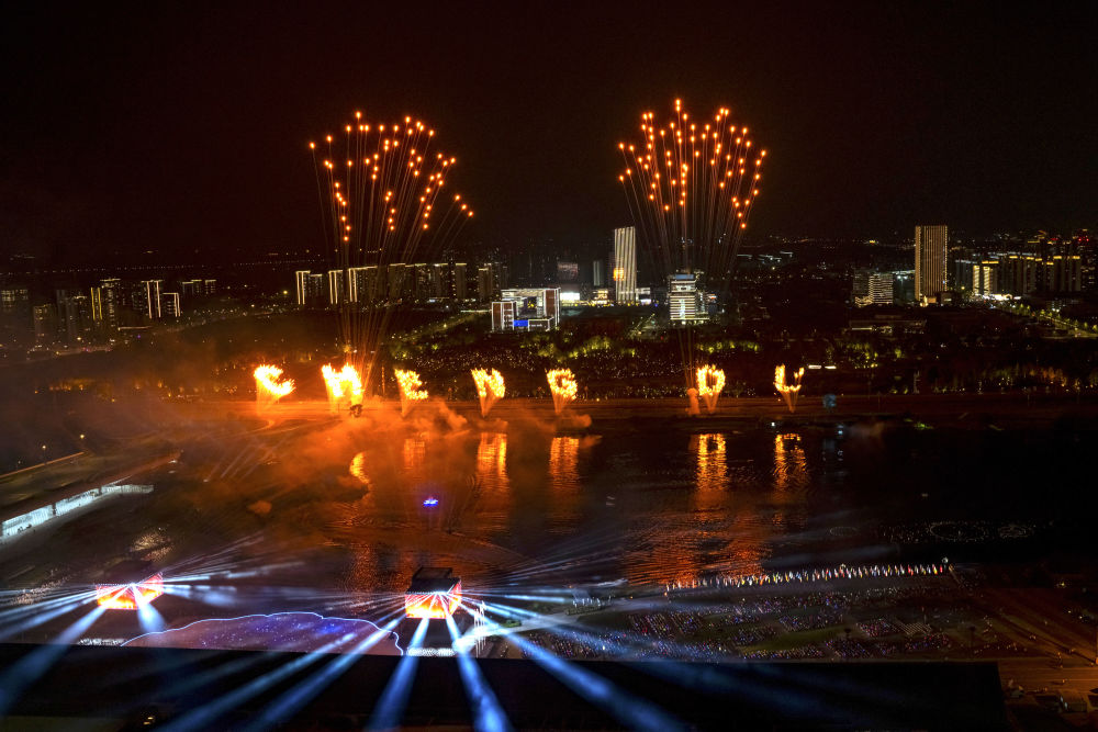 2025年8月7日在成都拍攝的第12屆世界運動會開幕式上的焰火表演。焰火中的“成都”來自青銅器上的篆書銘文。通過現(xiàn)代科技的煙火表演,將古蜀文明展示給全世界觀眾。