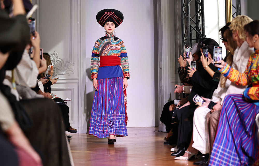 2025年10月1日,在法國巴黎中國文化中心舉行的第三屆中法時裝周上,模特在“非遺四川·百城百藝”鹽邊·傈僳族服飾時尚秀上展示服裝。