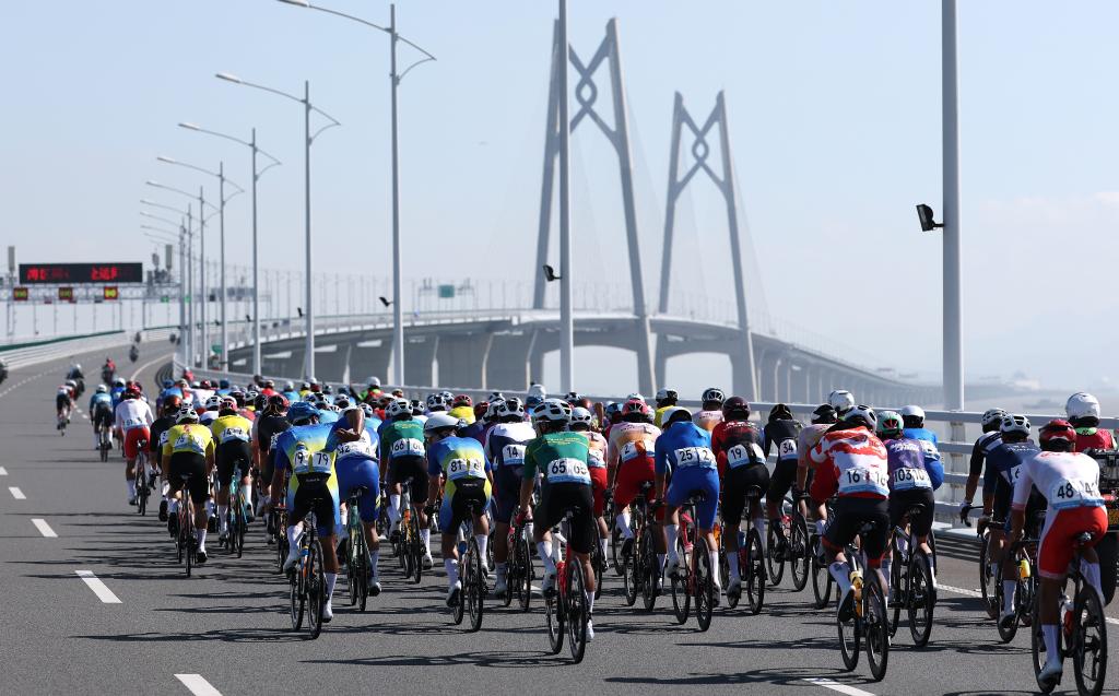 11月8日,參賽選手在港珠澳大橋騎行。當(dāng)日進(jìn)行的第十五屆全國(guó)運(yùn)動(dòng)會(huì)公路自行車男子個(gè)人賽,賽道全程231.8公里,選手經(jīng)過港珠澳大橋,跨越粵港澳三地。圖源:新華社