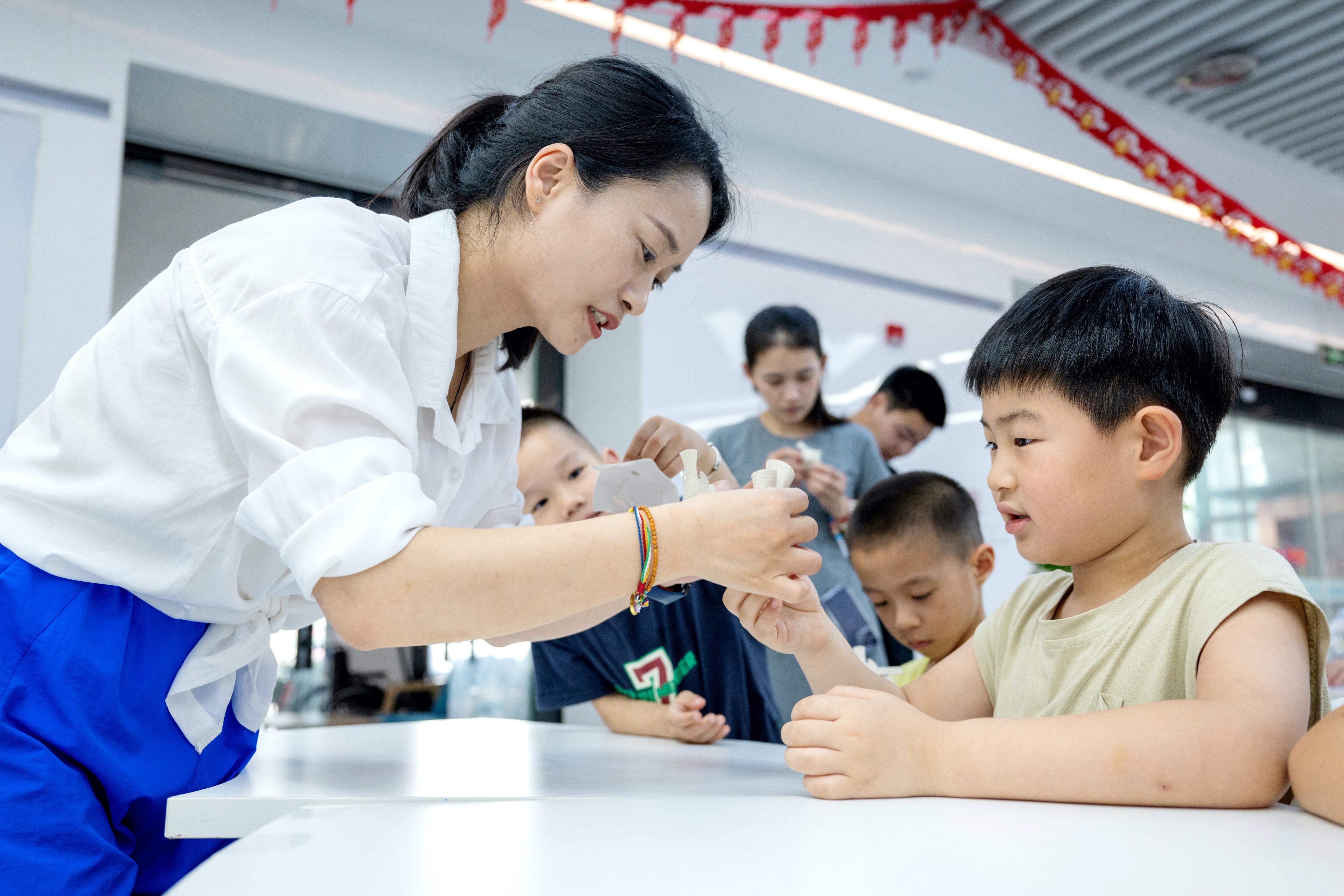 2025年7月3日,浙江湖州長(zhǎng)興縣龍山街道齊北社區(qū)幸福鄰里中心,志愿者指導(dǎo)孩子們制作手工。