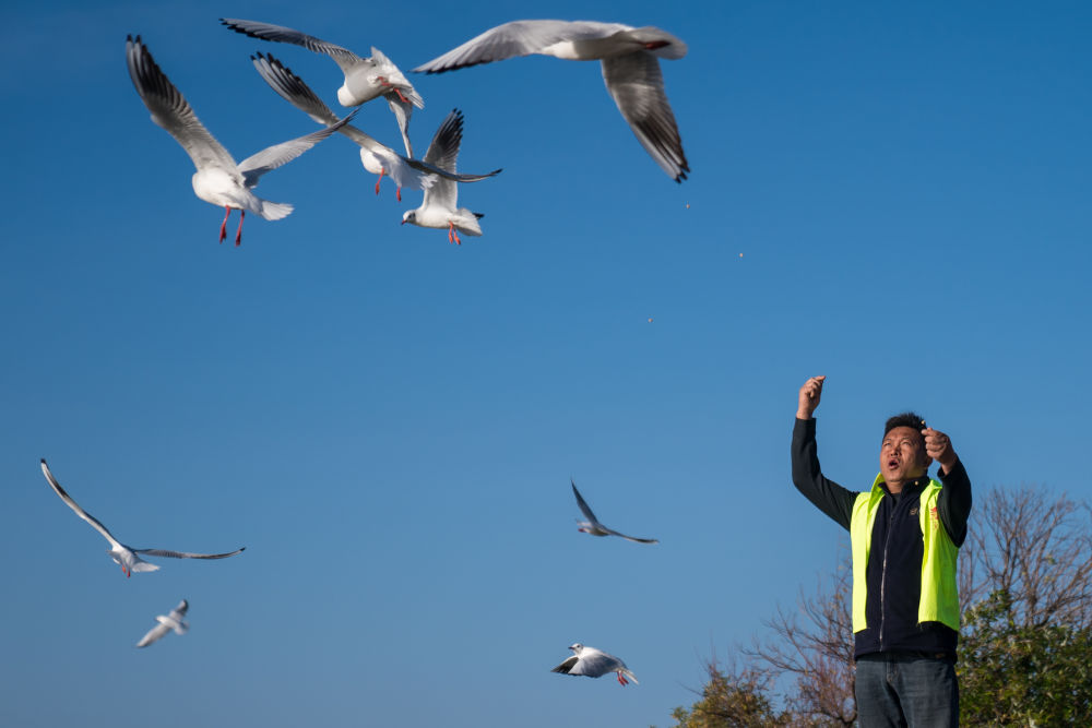 2024年12月11日,志愿者張利云在云南昆明王官濕地公園投喂紅嘴鷗。志愿者張利云堅(jiān)持投喂紅嘴鷗長(zhǎng)達(dá)十余年,為生態(tài)環(huán)境保護(hù)貢獻(xiàn)個(gè)人力量。