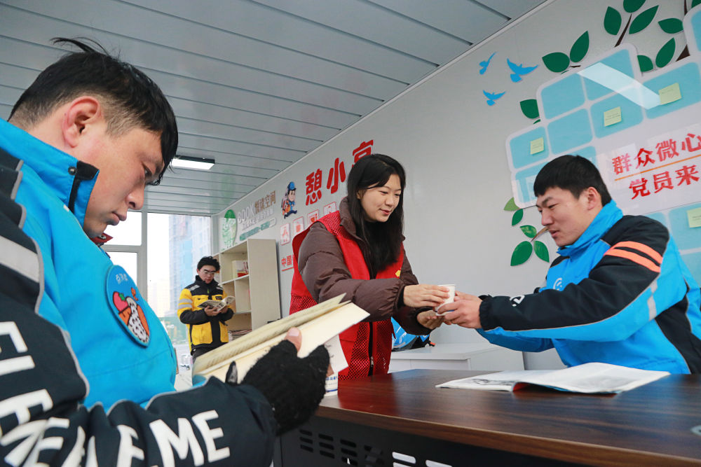 2023年12月27日,志愿者在山東省高密市密水街道“憩小亭”服務(wù)站為外賣騎手送上熱水。入冬以來,山東省高密市密水街道推進(jìn)“憩小亭”暖心服務(wù)站建設(shè),為外賣騎手、快遞小哥、網(wǎng)約車司機(jī)、環(huán)衛(wèi)工人等戶外勞動(dòng)者提供飲水、無線上網(wǎng)、食物加熱等多項(xiàng)服務(wù),讓他們感受到冬日里的溫暖。