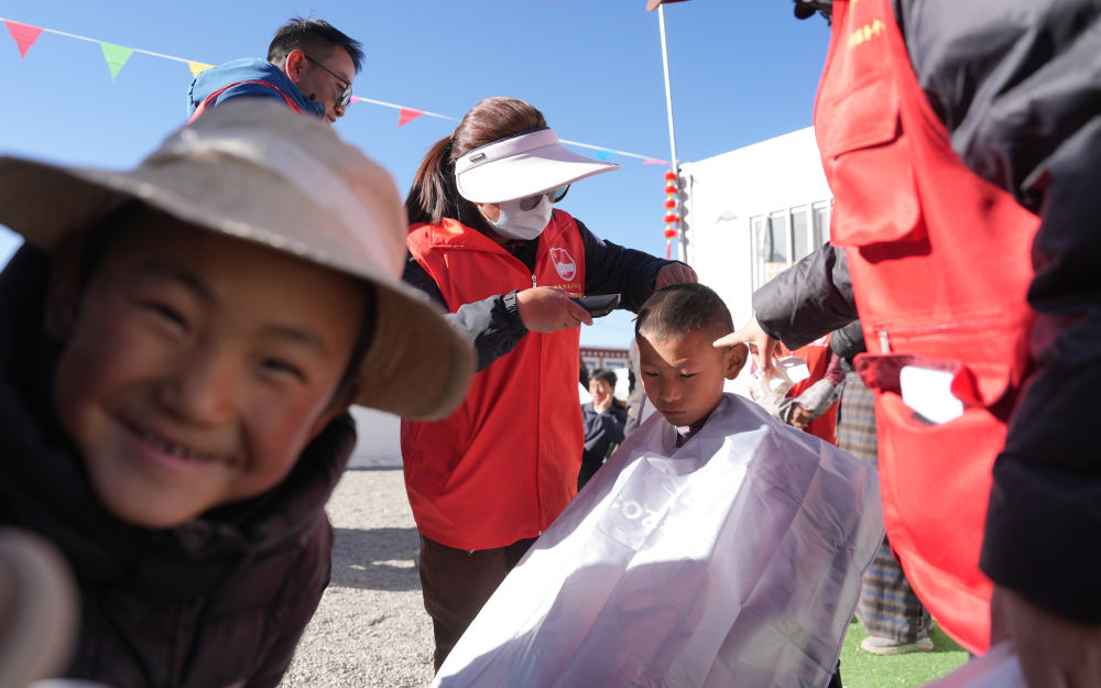 2025年1月26日,志愿者在西藏拉孜縣吉如村安置點(diǎn)為孩子們理發(fā)。西藏定日縣6.8級(jí)地震發(fā)生后,志愿者們迅速參與救援搜救、協(xié)助搭建帳篷、搬運(yùn)賑濟(jì)物資、協(xié)調(diào)村民所需。數(shù)百名大學(xué)生組成志愿者服務(wù)隊(duì),白天為安置點(diǎn)的孩子們輔導(dǎo)作業(yè)、陪孩子們運(yùn)動(dòng);晚上組成巡邏隊(duì),守護(hù)安置點(diǎn)的安寧。