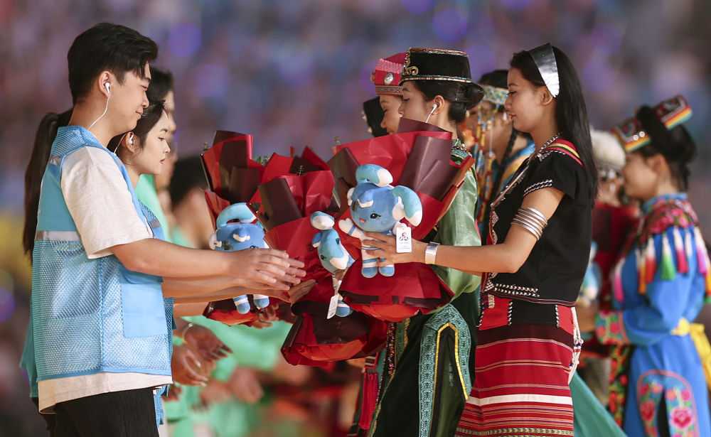 2024年11月30日,五十六個(gè)民族代表在海南三亞舉行的第十二屆全國少數(shù)民族傳統(tǒng)體育運(yùn)動(dòng)會(huì)閉幕式上為志愿者獻(xiàn)花。運(yùn)動(dòng)會(huì)期間,數(shù)千名志愿者“小鹿鹿”奔赴十余個(gè)競(jìng)賽場(chǎng)館、二十多家接待酒店、媒體中心、機(jī)場(chǎng)車站等地,為來自全國各地的運(yùn)動(dòng)員、技術(shù)官員、工作人員和觀眾提供禮賓接待、交通引導(dǎo)、安全保衛(wèi)等志愿服務(wù)。