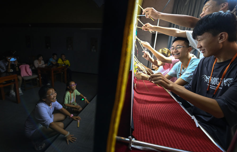2023年8月8日,進(jìn)行暑期研學(xué)的學(xué)生在位于西安的中國秦腔藝術(shù)博物館里體驗(yàn)皮影戲演出。