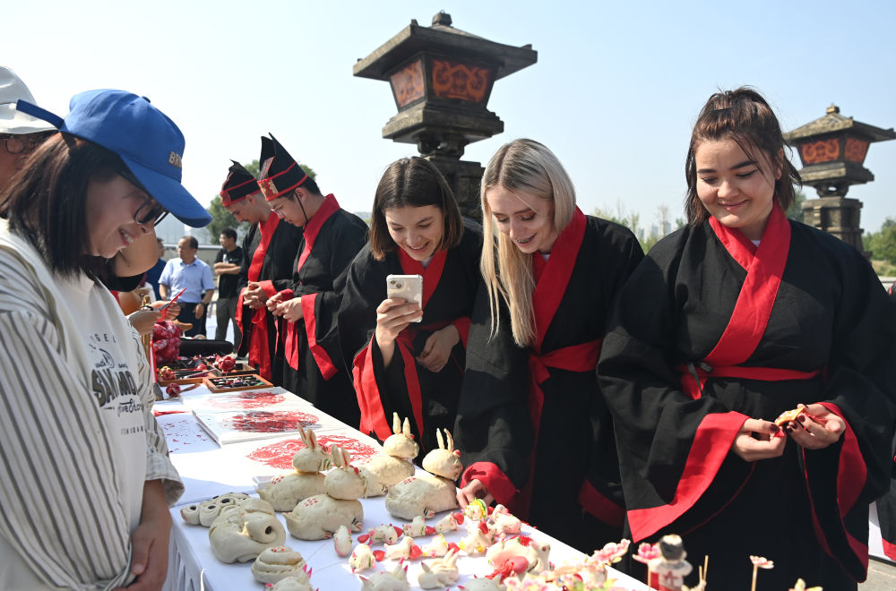 2023年9月16日,“絲路起點(diǎn) 文明根脈”2023西安絲路留學(xué)生交流活動在西安啟動,來自西安交通大學(xué)的百名中外大學(xué)生著漢服、行漢禮,通過沉浸式體驗(yàn),了解中國傳統(tǒng)文化。這是中外大學(xué)生在交流活動上了解陜西非遺。