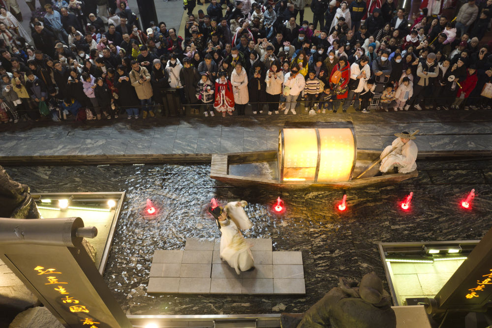 游客在西安大唐不夜城景區(qū)觀看以唐代歷史文化為背景創(chuàng)作的情景劇(無人機(jī)照片,2025年1月22日攝)。
