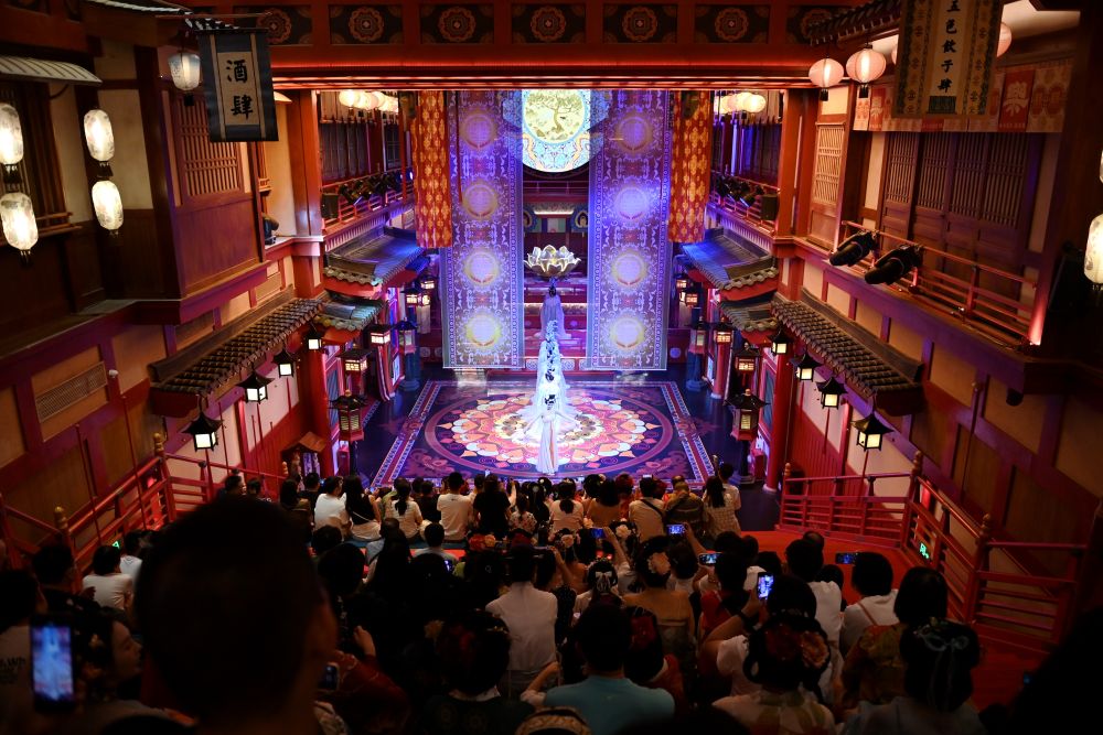 2024年5月12日,游客在西安長安十二時(shí)辰主題街區(qū)內(nèi)觀看演出。街區(qū)通過漢服旅拍、演藝互動、非遺體驗(yàn)等項(xiàng)目,讓游客“穿越”回盛唐長安,為游客打造科技感、文化味十足的游歷體驗(yàn)。