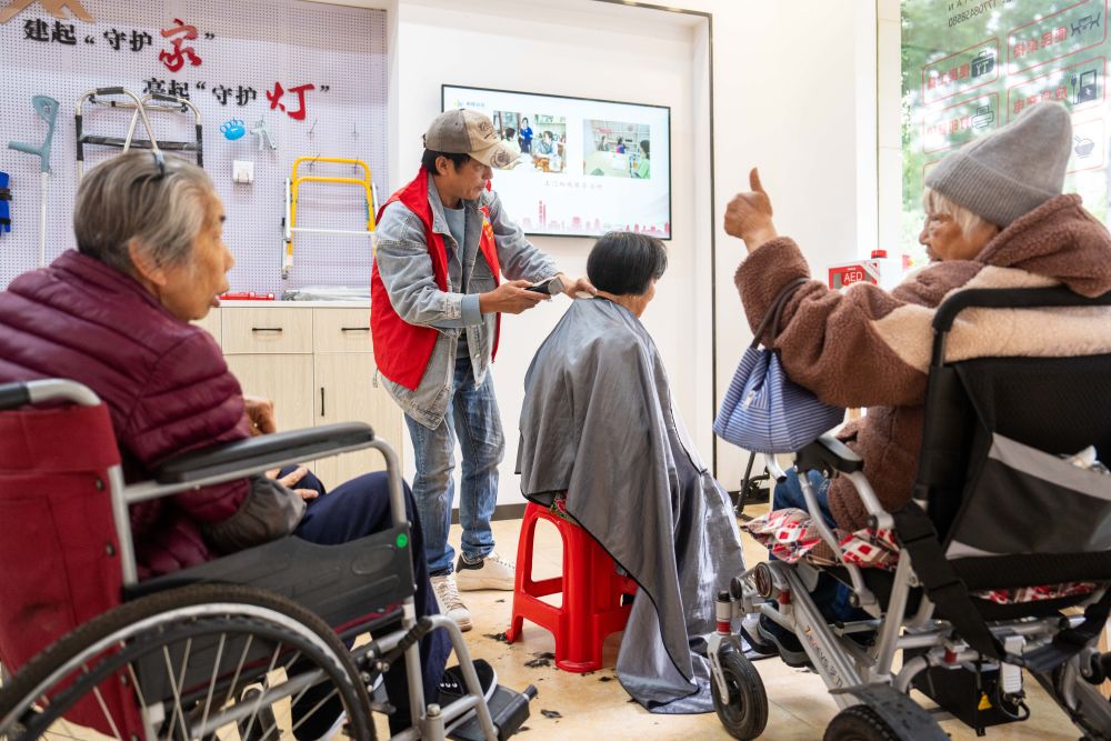 2025年11月6日,在湖南省長(zhǎng)沙市望城區(qū)高塘嶺街道湘陵社區(qū),志愿者為老年人和殘疾人士免費(fèi)理發(fā)。新華社記者 陳思汗 攝