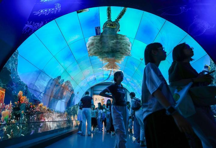 2025年7月15日,游客在玉溪市澄江化石地世界自然遺產(chǎn)博物館“寒武紀海底隧道”參觀。