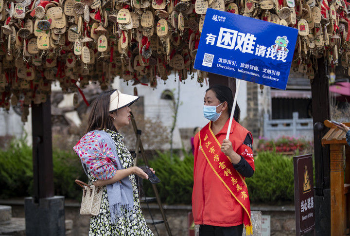 2023年5月18日,一名游客(左)在麗江古城向志愿者咨詢。2015年12月,云南麗江古城保護管理局牽頭成立了麗江古城旅游志愿者服務隊,志愿者主要來自市區(qū)機關單位、古城保護管理局、古城經(jīng)營戶、在校學生、社區(qū)居民等,常年在古城內提供旅游咨詢、道路指引、文明引導等志愿服務。