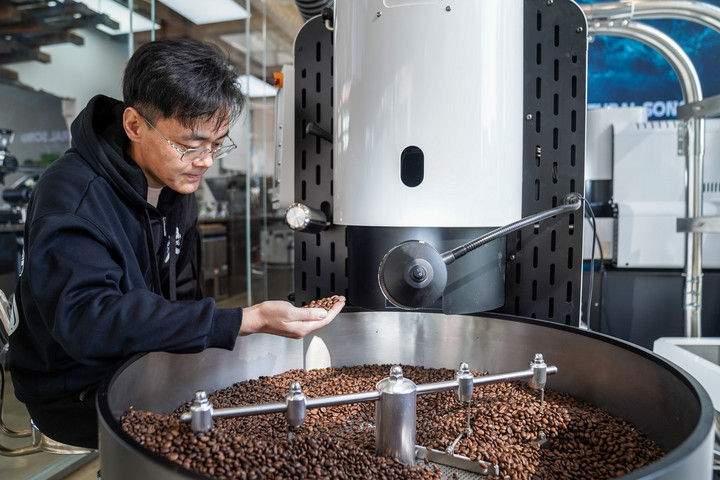 2025年12月10日,韓君瑋在位于昆明的南來盛咖啡店內烘焙咖啡豆。