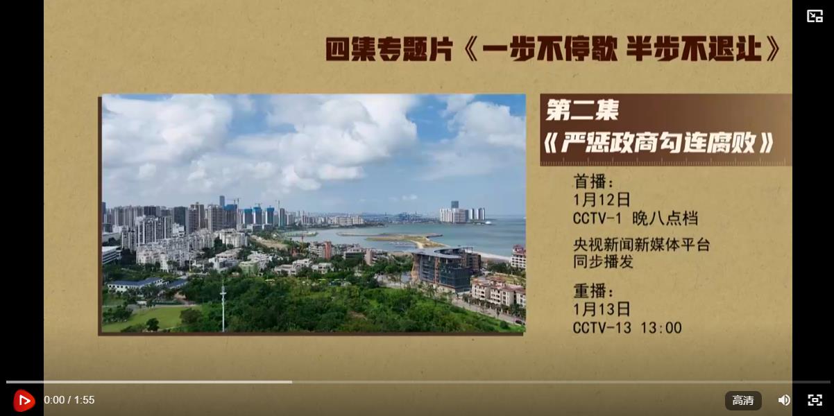 反對腐敗、建設(shè)廉潔政治,是我們黨一貫堅(jiān)持的鮮明政治立場,是黨自我革命必須長期抓好的重大政治任務(wù)。要把嚴(yán)懲政商勾連腐敗作為攻堅(jiān)戰(zhàn)重中之重,堅(jiān)決打擊以權(quán)力為依托的資本逐利行為,堅(jiān)決防止各種利益集團(tuán)、權(quán)勢團(tuán)體向政治領(lǐng)域滲透,不斷凈化政治生態(tài),推動構(gòu)建親清統(tǒng)一的新型政商關(guān)系,促進(jìn)經(jīng)濟(jì)社會高質(zhì)量發(fā)展。電視專題片《一步不停歇半步不退讓》第二集《嚴(yán)懲政商勾連腐敗》,講述紀(jì)檢監(jiān)察機(jī)關(guān)聚焦政治問題和經(jīng)濟(jì)問題交織的腐敗案件,嚴(yán)懲以商養(yǎng)官、以官護(hù)商、官商一體等問題,堅(jiān)決破除政商勾連“利益共同體”??偱_央視綜合頻道1月12日晚8點(diǎn)檔播出,央視新聞新媒體平臺同步播發(fā)。