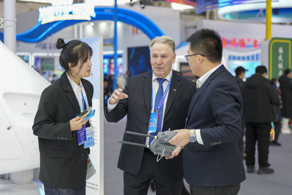 1月6日,在2026哈爾濱國際冰雪經(jīng)濟博覽會現(xiàn)場,參會嘉賓(中)在了解一款工業(yè)無人機的參數(shù)和性能。新華社記者 王松 攝