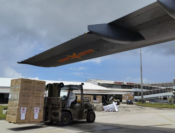 工作人員在湯加首都努庫阿洛法機(jī)場卸載中國運(yùn)-20飛機(jī)運(yùn)送來的援助物資(2022年1月28日攝,手機(jī)照片)。