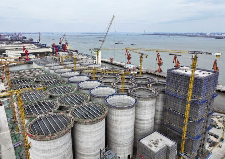 在江蘇省靖江市拍攝的中糧靖江碼頭倉儲(chǔ)物流項(xiàng)目建設(shè)現(xiàn)場(chǎng)(2025年2月20日攝,無人機(jī)照片)。新華社發(fā)(顧繼紅攝)