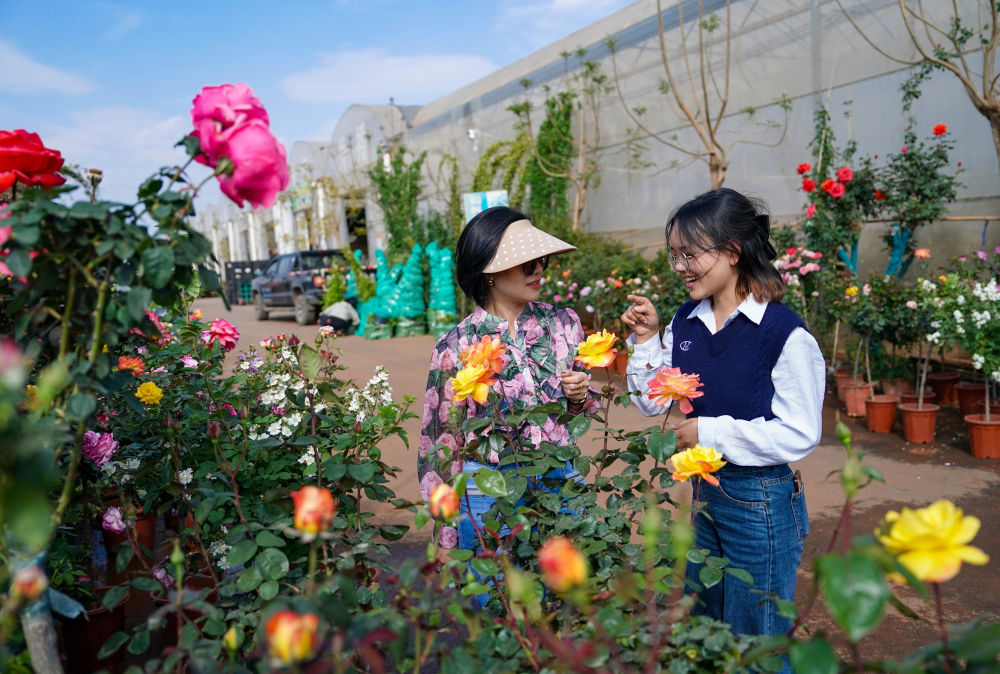 2025年4月11日,越南花商阮翠云(左)與翻譯李青歌在云南昆明斗南一花卉基地內(nèi)查看鮮花品質(zhì)。2018年,阮翠云開始在越南銷售云南花卉,讓七彩“云花”成為眾多越南家庭的“??汀薄=柚咝У碾娚唐脚_和快捷的物流網(wǎng)絡(luò),鮮花從云南花田到河內(nèi)貨架實(shí)現(xiàn)了“次日達(dá)”。