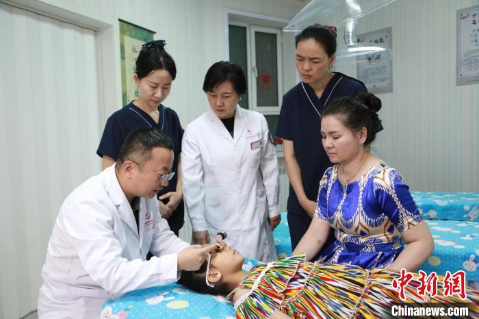 劉登教授在新疆庫(kù)爾勒市婦幼保健院現(xiàn)場(chǎng)帶教醫(yī)務(wù)人員應(yīng)用中醫(yī)“亢氏療法”技術(shù)為兒童治療近視。(上?!爸嗅t(yī)光明行”醫(yī)療隊(duì)供圖)