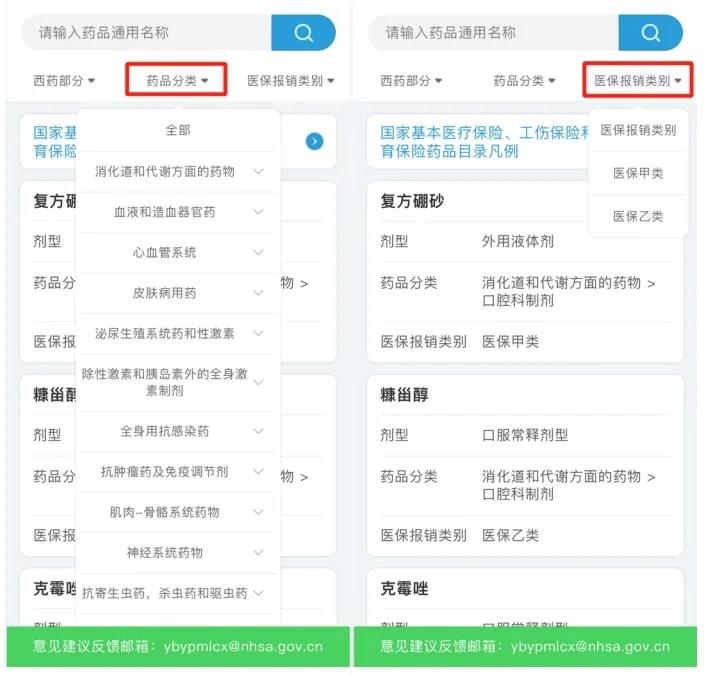 也可以根據(jù)自己的需求,選擇“藥品分類”或“醫(yī)保報(bào)銷類別”進(jìn)行篩選。