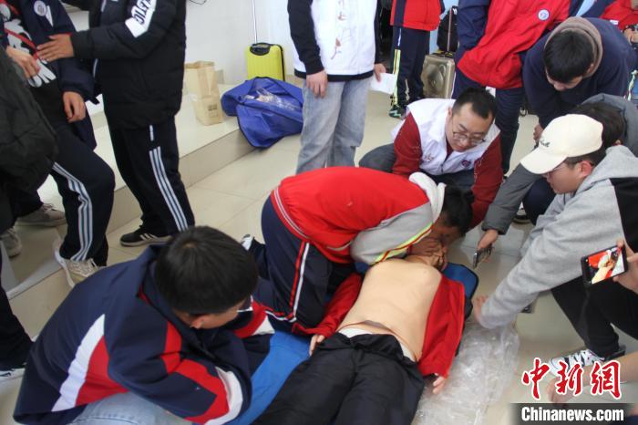 圖為內蒙古醫(yī)科大學附屬醫(yī)院青年志愿者服務隊進校園,王坤(左三)教學生心肺復蘇急救方法?!让晒裴t(yī)科大學附屬醫(yī)院供圖