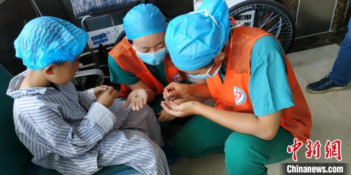 圖為青年志愿者服務隊隊員陪伴小患者做游戲?!让晒裴t(yī)科大學附屬醫(yī)院供圖