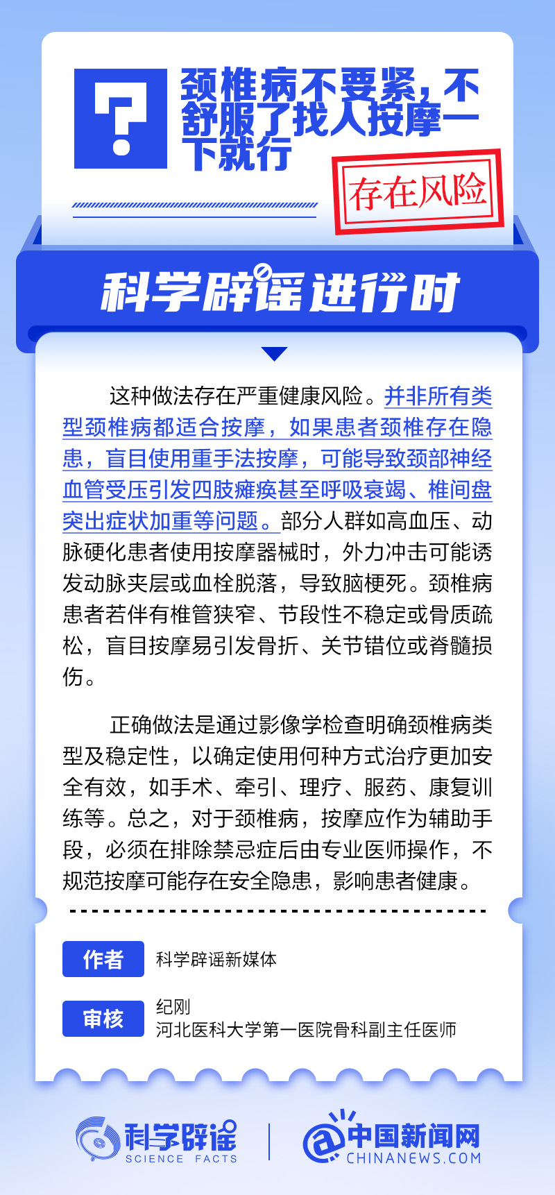 并非所有類型頸椎病都適合按摩,如果患者頸椎存在隱患,盲目使用重手法按摩,可能導(dǎo)致頸部神經(jīng)血管受壓引發(fā)四肢癱瘓甚至呼吸衰竭,椎間盤突出癥狀加重等問題。部分人群如高血壓、動脈硬化患者使用按摩器械時,外力沖擊可能誘發(fā)動脈夾層或血栓脫落,導(dǎo)致腦梗死。頸椎病患者若伴有椎管狹窄、節(jié)段性不穩(wěn)定或骨質(zhì)疏松,盲目按摩易引發(fā)骨折、關(guān)節(jié)錯位或脊髓損傷。(來源:@科學(xué)辟謠 中國新聞網(wǎng)微博)