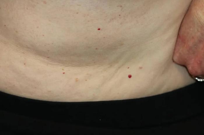 還有一個值得說的一個現(xiàn)象,是皮膚長紅痣,也就是散在的小紅點,就像下圖這樣。