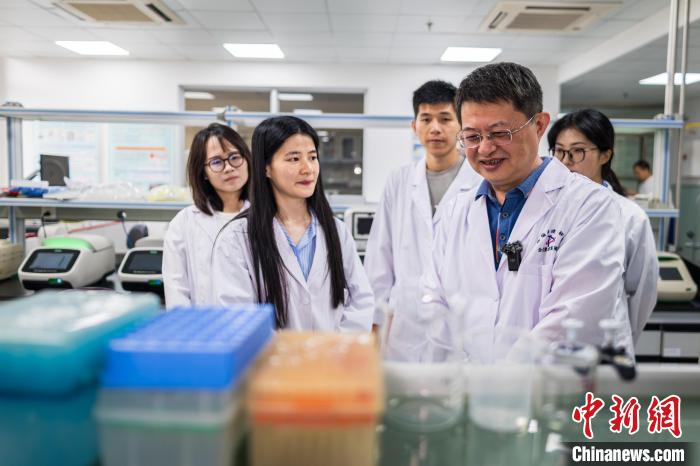 5日,廈門大學公共衛(wèi)生學院院長張軍(左四)與研發(fā)團隊交流?!≈行戮W記者 李思源 攝