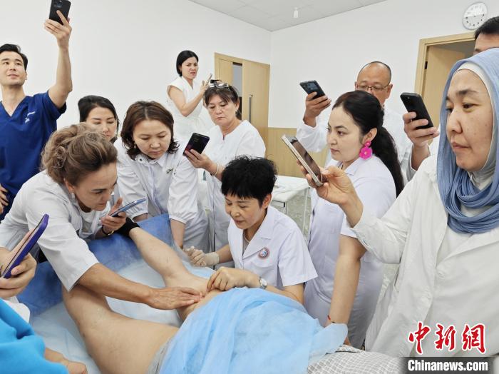 學(xué)員阿依古麗是阿斯塔納市政府運(yùn)動(dòng)醫(yī)學(xué)醫(yī)院一名從業(yè)30年的康復(fù)治療師及正骨醫(yī)師,2023年,她跨越千里來(lái)到中國(guó)陜西,在西安中醫(yī)腦病醫(yī)院參加了培訓(xùn)班,感受到了中醫(yī)的療效。在分組實(shí)操環(huán)節(jié),阿依古麗請(qǐng)求老師在她的腿部進(jìn)行治療演示,方便切身感受針尖下的力學(xué)平衡奧秘。