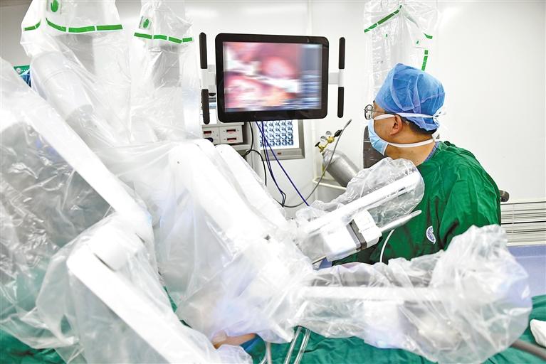 圖為自治區(qū)人民醫(yī)院普通外科主任巴桑頓珠運用第四代手術機器人開展外科手術。