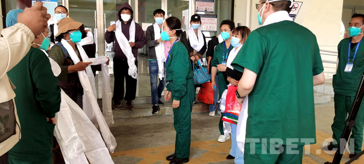 圖為8月18日下午 來(lái)自拉薩市方艙醫(yī)院出艙的第二批14名無(wú)癥狀感染者與醫(yī)護(hù)人員互獻(xiàn)哈達(dá) 由拉薩市融媒體中心供圖