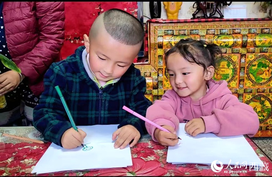 向巴貢丹(左)和妹妹一起在家畫畫。 人民網(wǎng) 李海霞攝