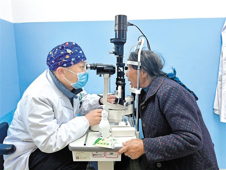 圖為醫(yī)護(hù)人員為前來(lái)問(wèn)診的農(nóng)牧民群眾進(jìn)行眼部檢查。記者 丹增平措 攝