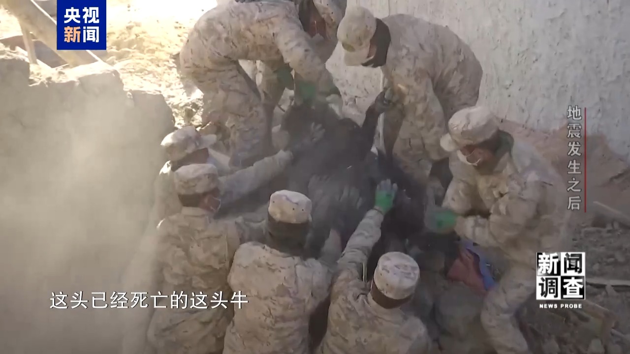 總臺央視記者 張騰飛:我現(xiàn)在在通來村洛桑大哥家牛圈的旁邊,地震對這里建筑造成的損毀情況還是非常嚴重的?,F(xiàn)在武警戰(zhàn)士正在清理的,就是牛圈里已經(jīng)死亡的牛。他告訴我,這個牛圈之前一共有5頭牛,當時地震來的時候有兩頭牛跑了出去,有3頭牛被埋壓在下面。在現(xiàn)場已經(jīng)開始有腐爛的味道了,正是因為這樣,我們要加緊把這些死亡的牲畜進行清理,從而來防止疫病的滋生。全村現(xiàn)在有100多頭的這種牛羊死亡,也是有多方的力量在加緊來幫助他們清理。