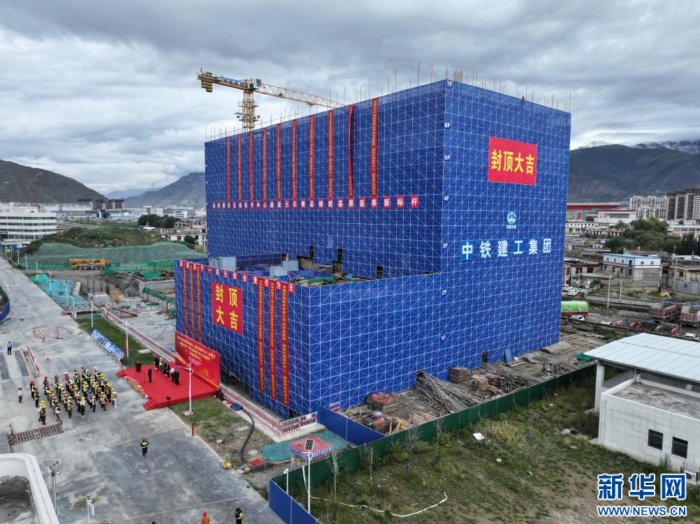 四川大學(xué)華西醫(yī)院西藏醫(yī)院(國(guó)家區(qū)域醫(yī)療中心)主體結(jié)構(gòu)封頂現(xiàn)場(chǎng)。(中鐵建工集團(tuán)供圖)